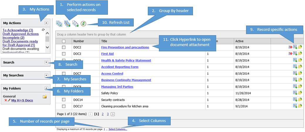 Each module in the Q-Pulse Web list view lets you search for and access list of records from the module, as well as manage folders of commonly-accessed records.